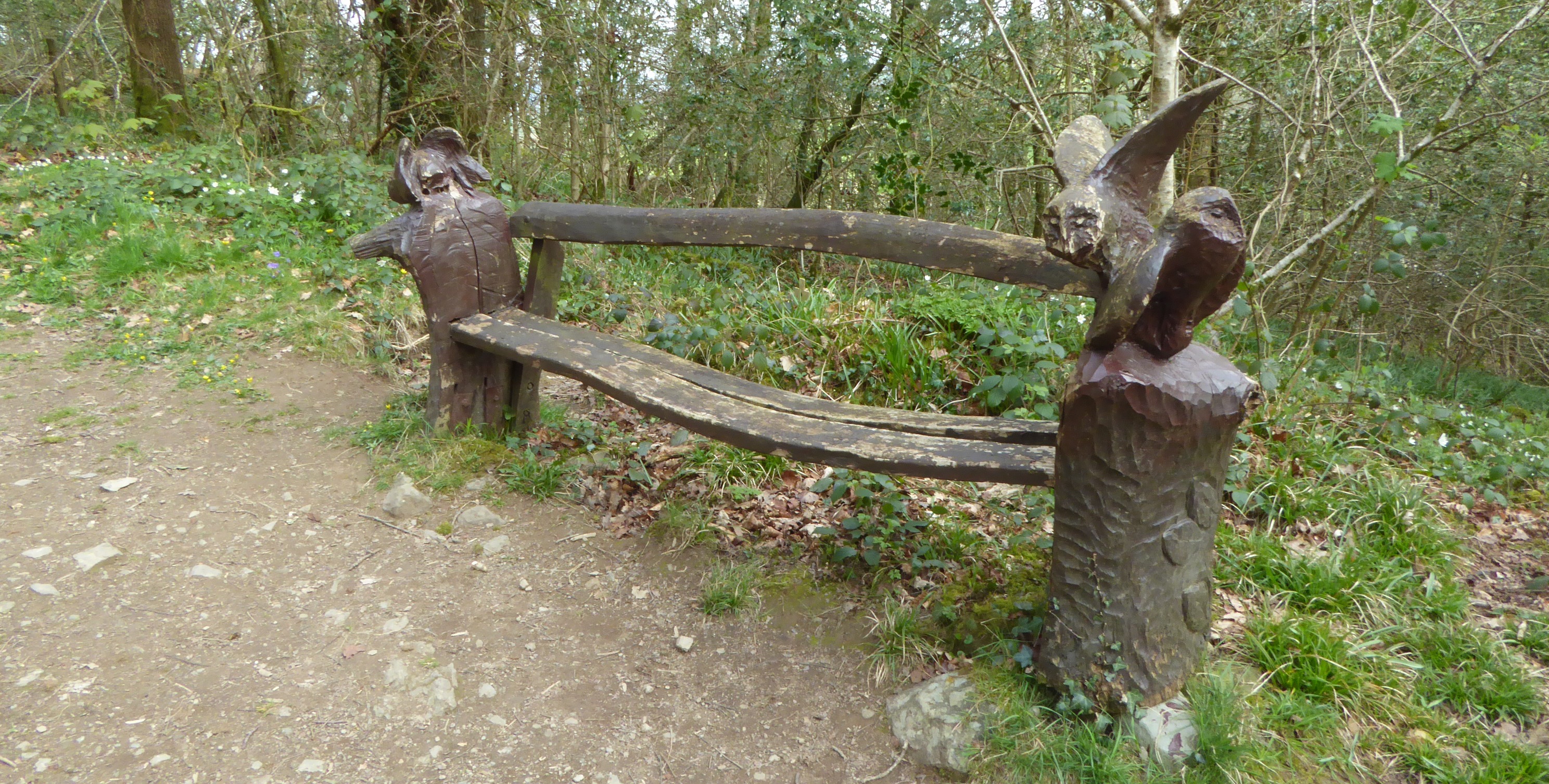 I leave the road and walk through Green Castle woods. Some one who is a very artist wood carver has made these seats.