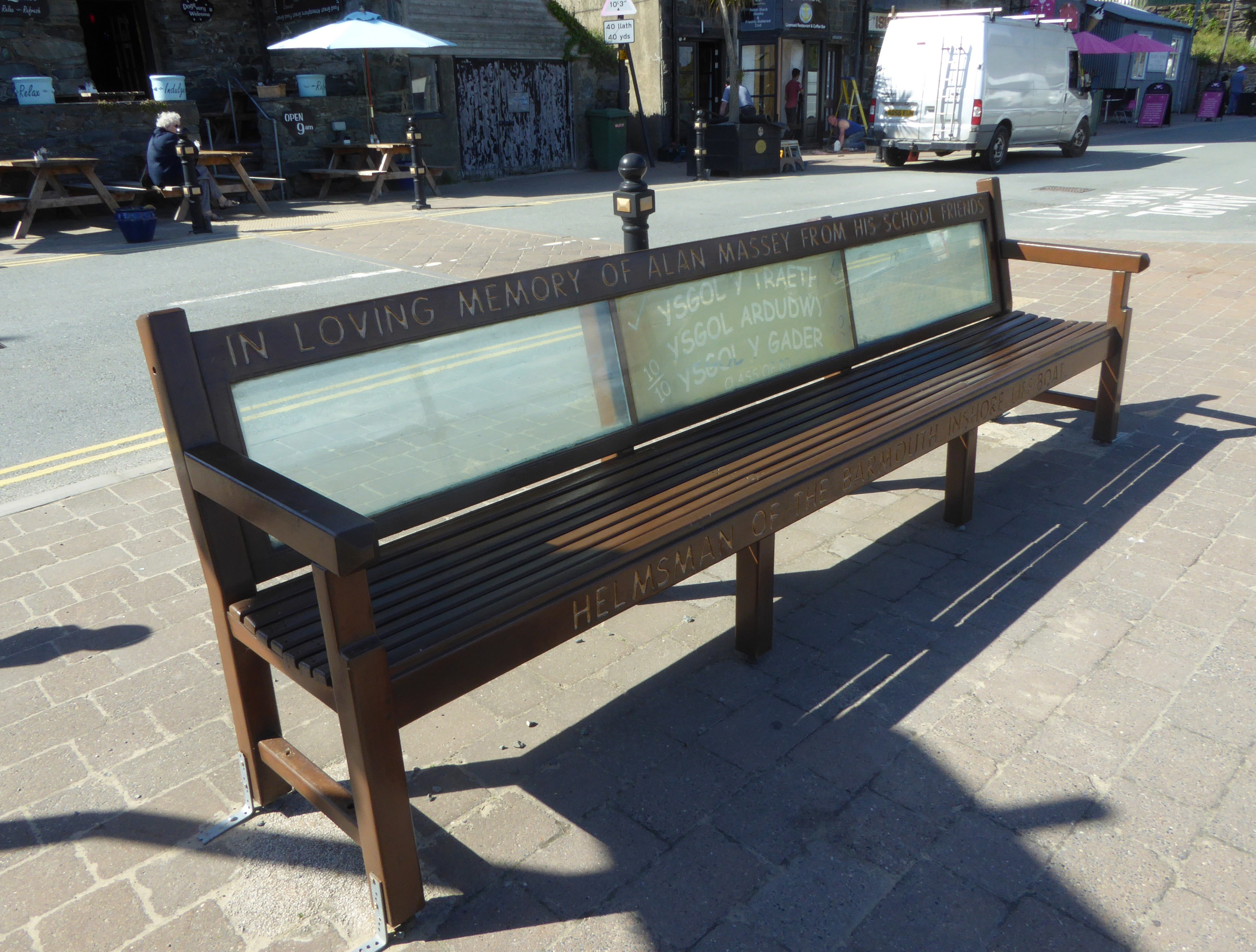 As I walk along the harbour I notice a seat which is a tribute to Alan Massey, a lifeboatman who was found dead in the harbour.