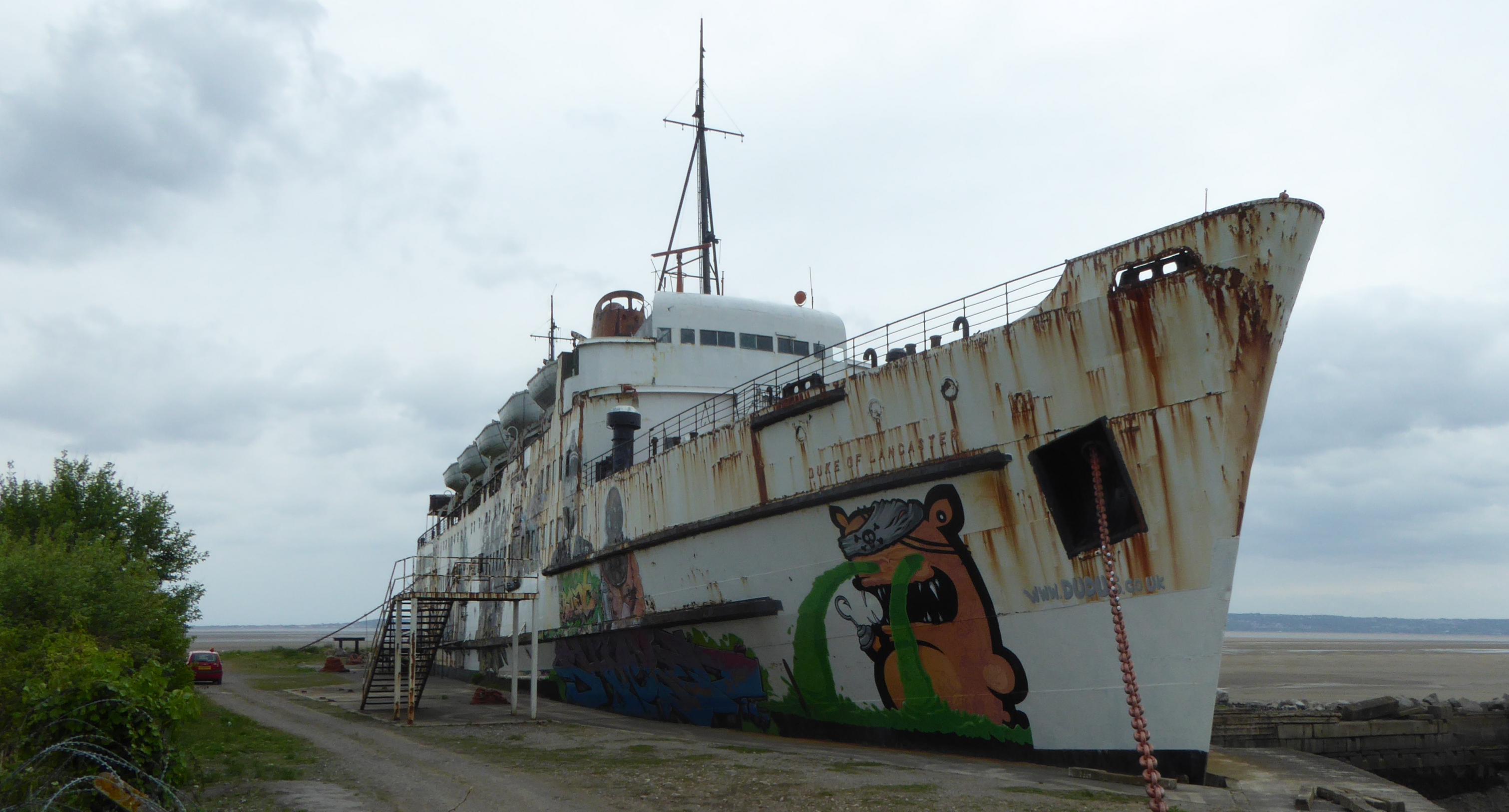 The strangest sight I saw was this huge boat stuck in a fairly small quay just south of Mostyn. In fact it was an old Sealink ferry called the HMS Lancaster. The owner intended turning it into a floating leisure and retail complex but due to legal disputes with the local council it never came to anything. Now it seems to be a blank canvas for graffiti artists, some of which are quite interesting.