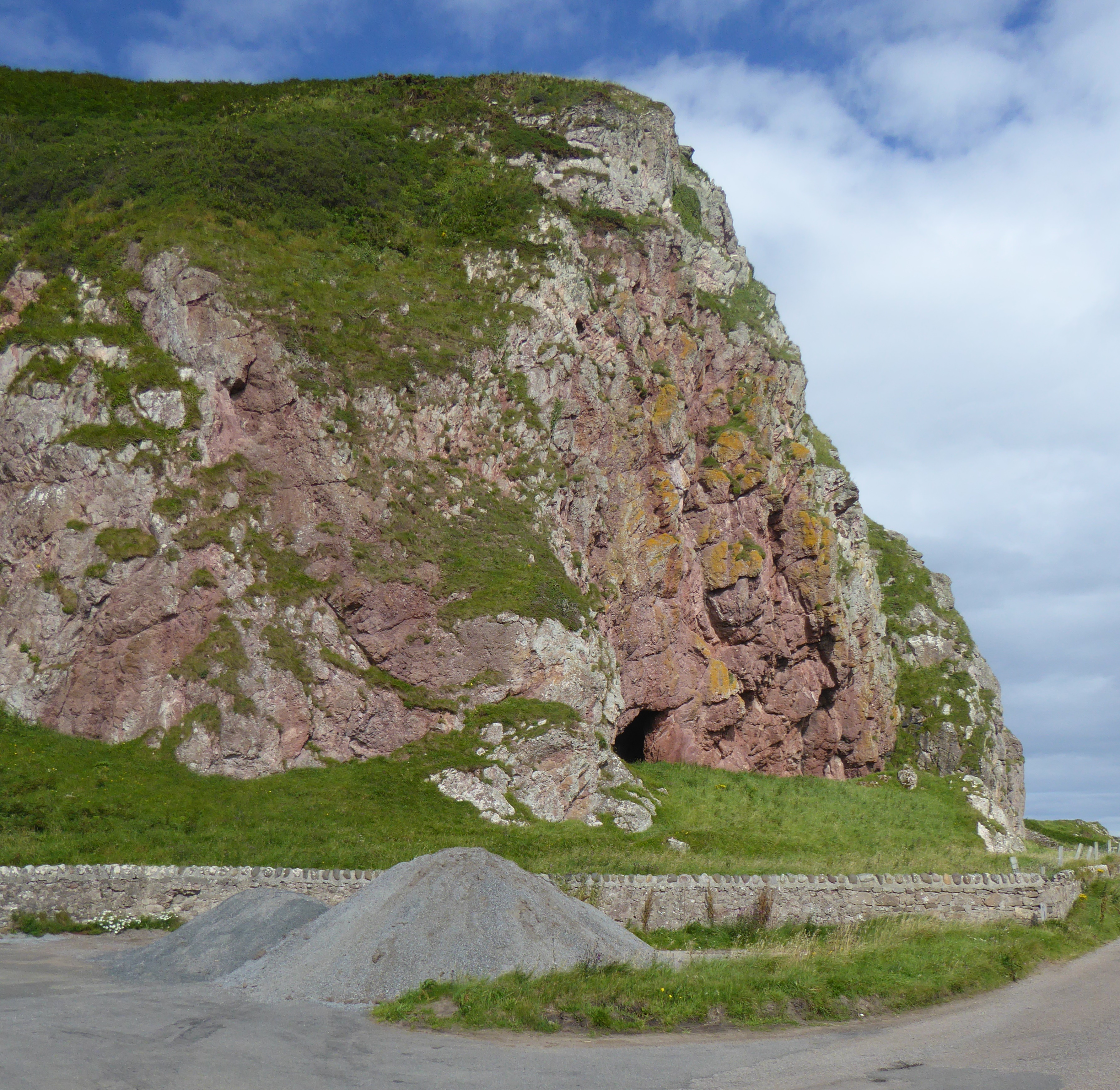 The most southerly point of the Kintyre peninsular is Dunaverty Head at Southend. The bay has a beautiful sandy beach overlooked by a Caravan site. I walk past the golf club down to the Roaring Cove and walk along the beach