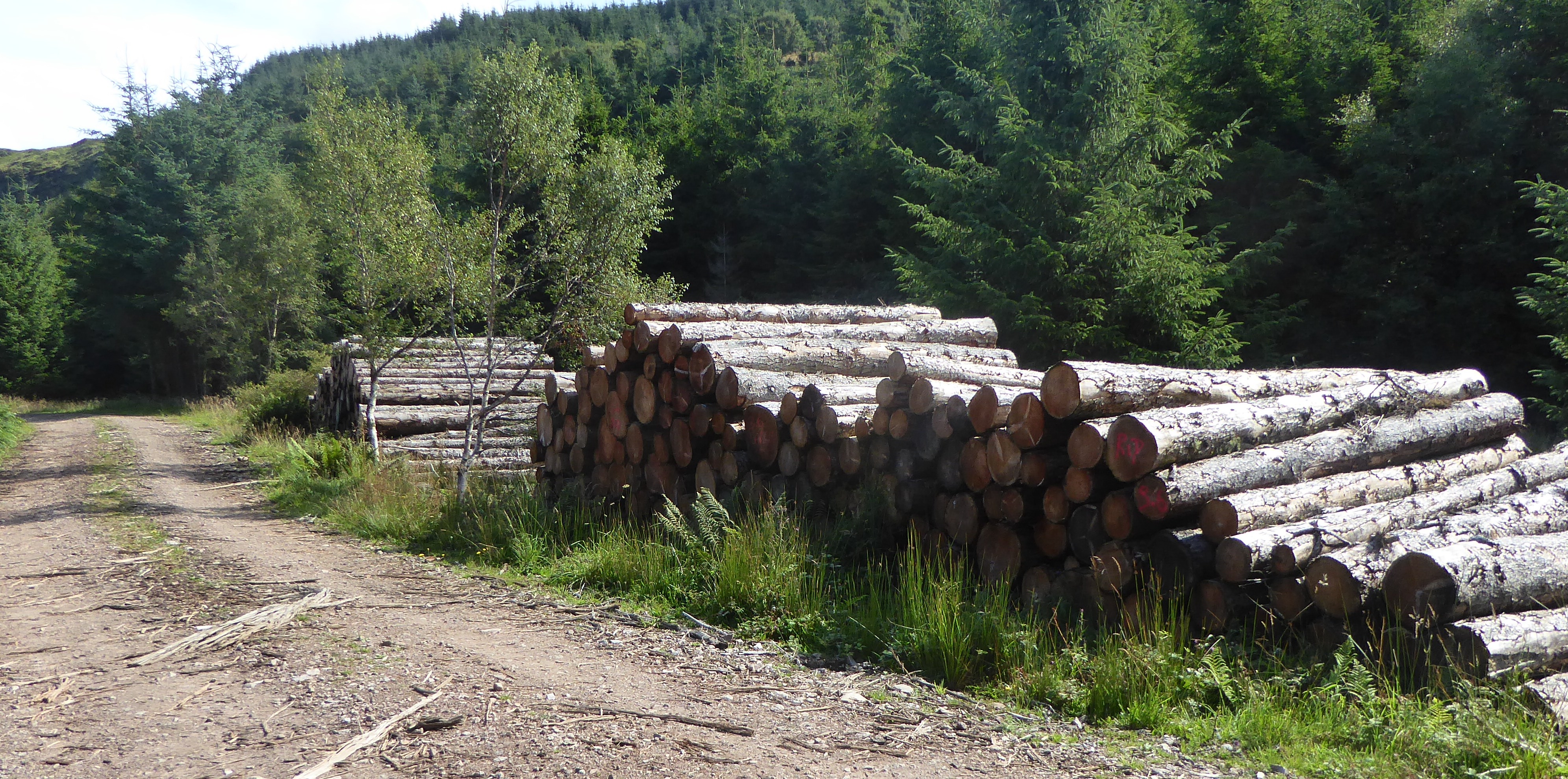 Although this was a cyclist route, I didn’t meet any cyclists on it. I pass an area where trees had been cut down and the logs stacked alongside the path ready for the lorries to come and take them to the mills for cutting.