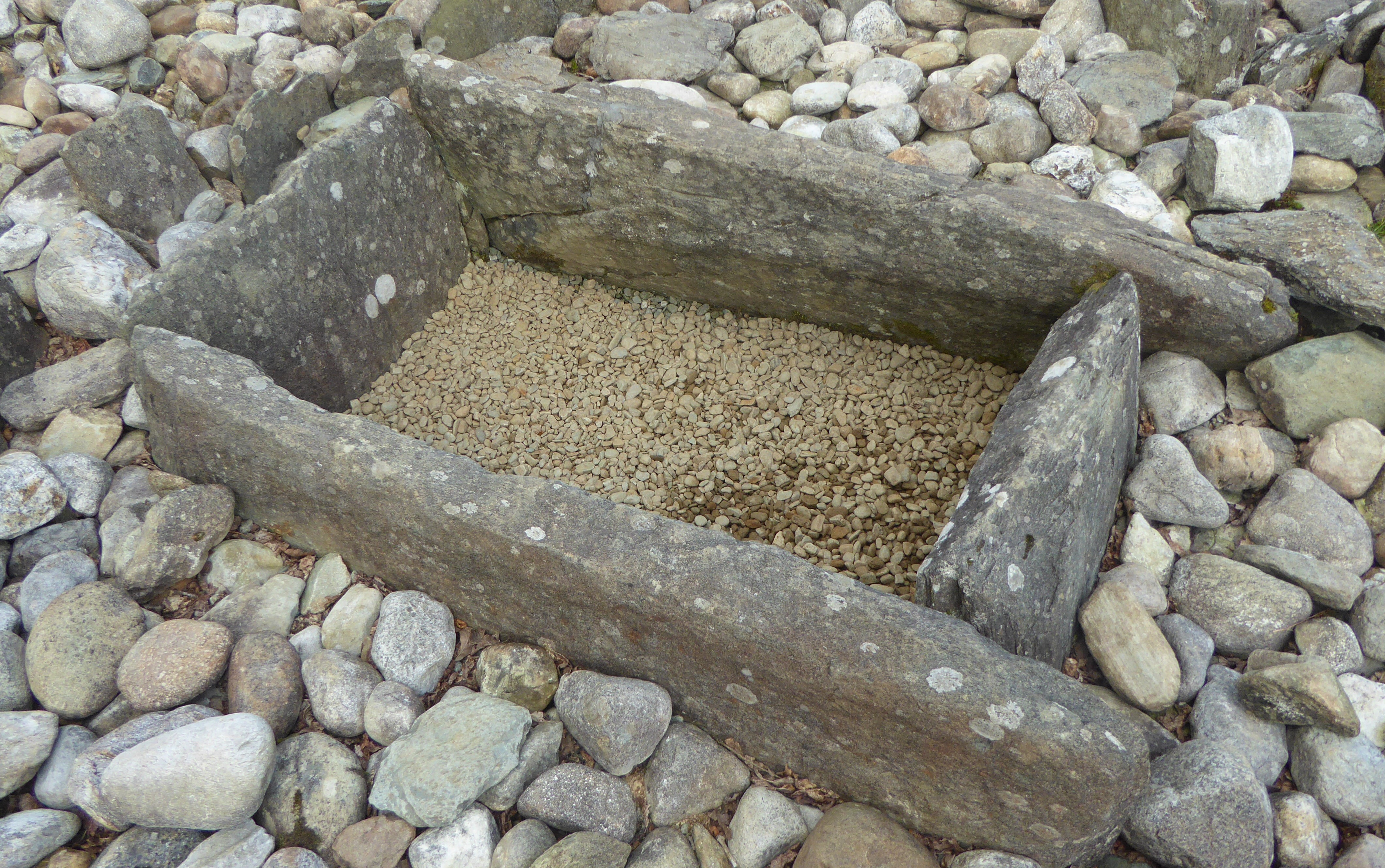 Ri Cruin Cairn is a bronze age burial cairn with three chambers. It is famous for the axe heads that have been cut into the stone slabs.