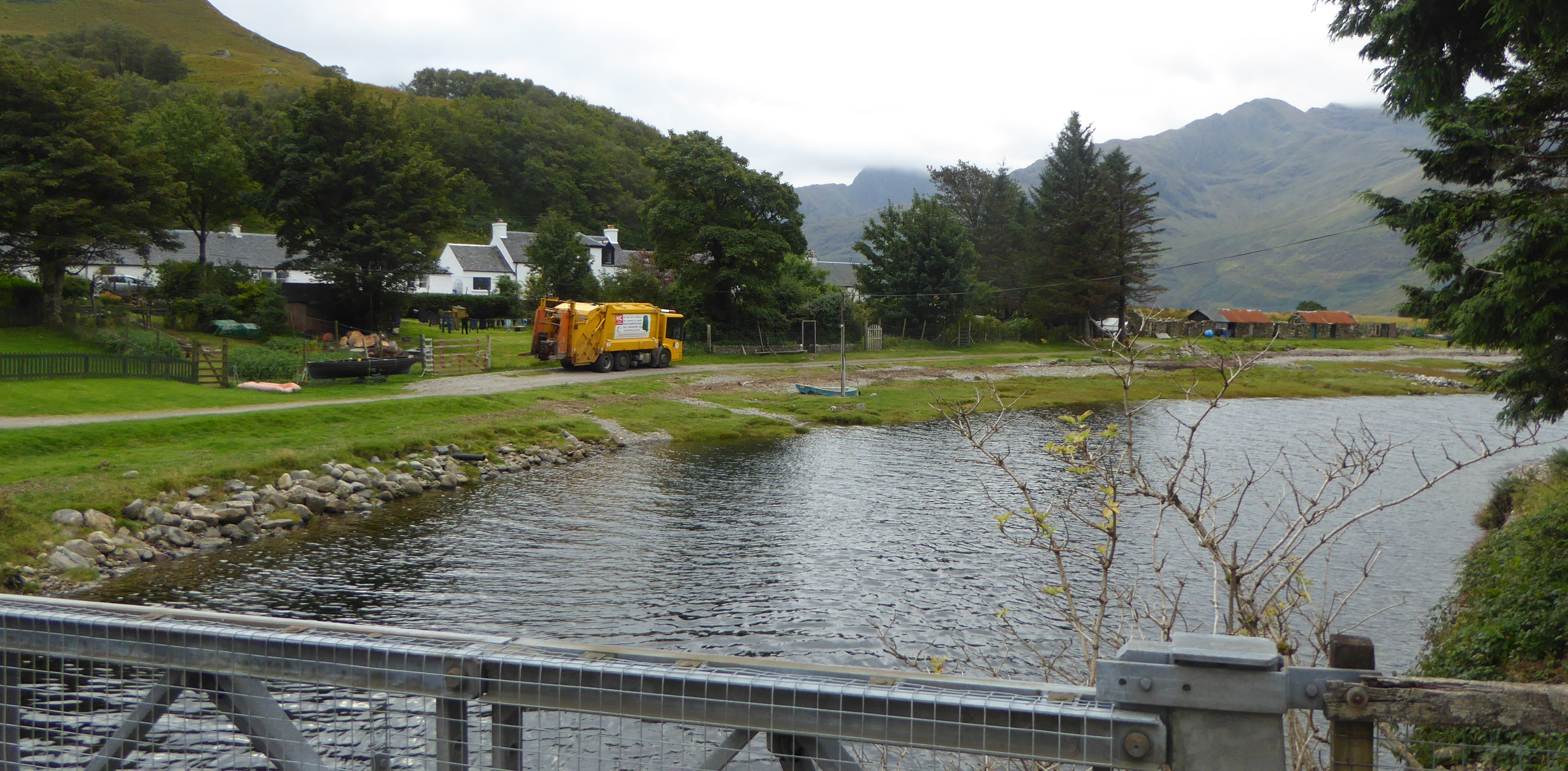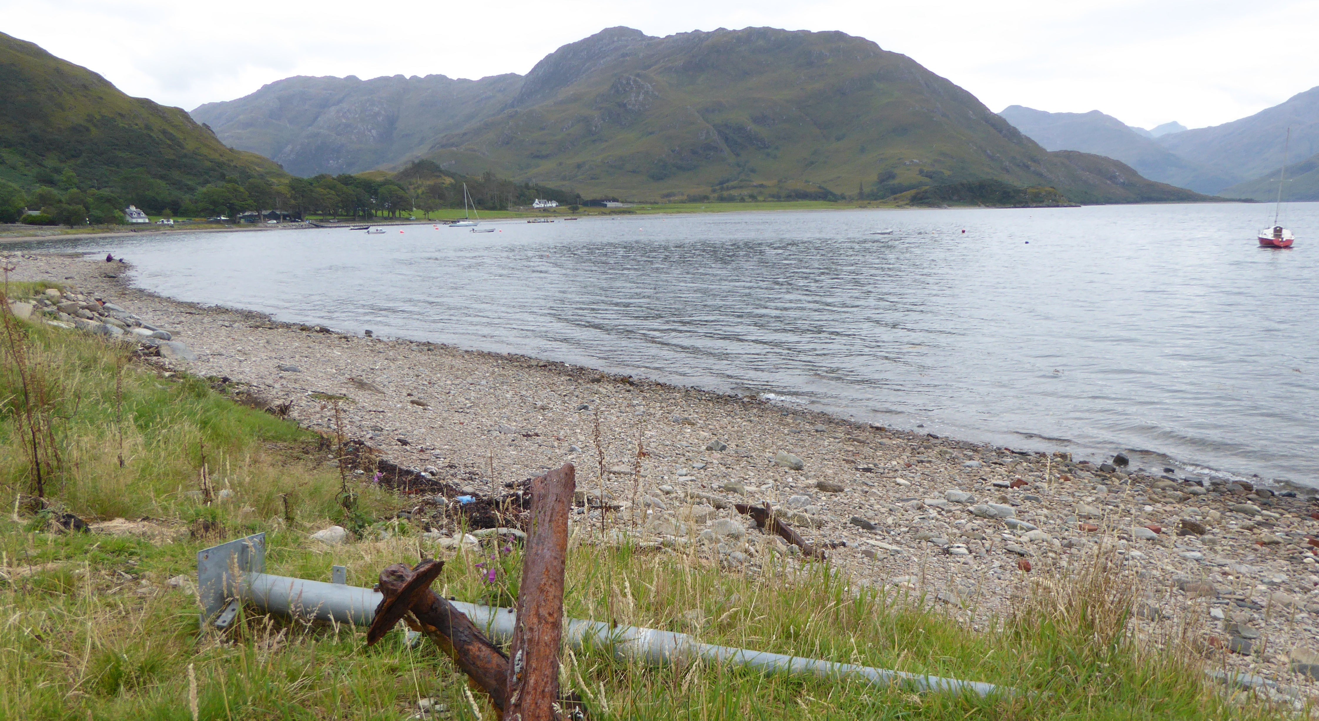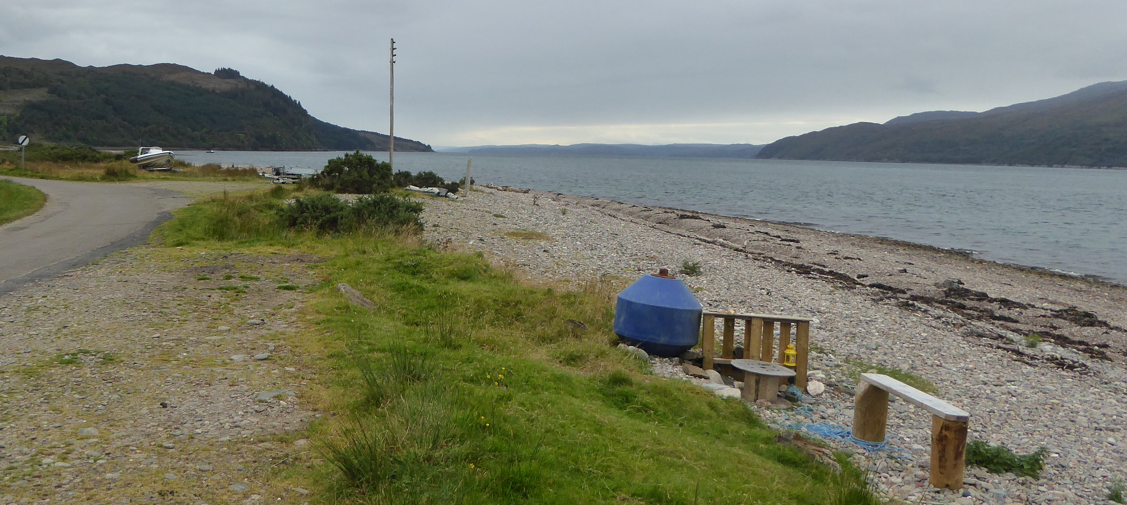 I follow the coast to Arnisdale with its line of cottages straggled around a shingle bay. I notice like a lot of the highland villages that it still has its red phone box. If you look hard enough along the grassy edge of the beach you come across rusty old anchors and old decaying boats. If you look outwards into the loch from here you can see the an Isle or a big rock called Eilean Tioram. Onwards I go.