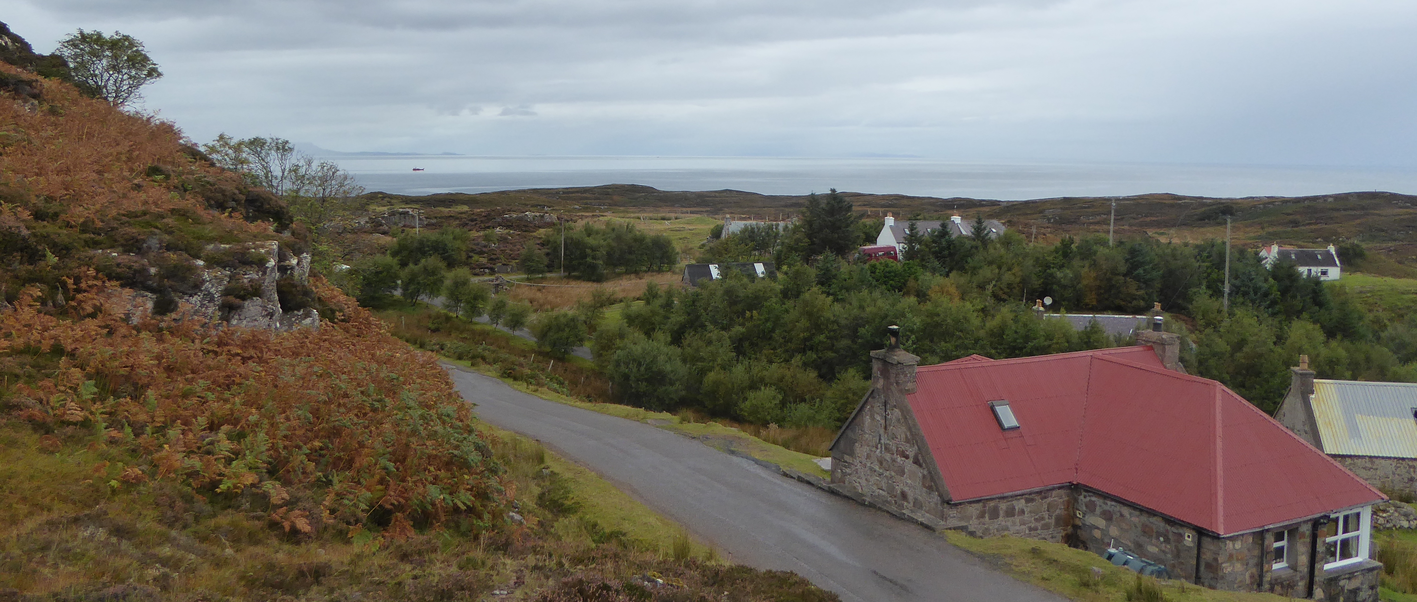 I pass Meallabhan with great views across the Inner Sound to the Isles of Raasay, Skye and Rona. I notice what look like three naval ships sailing in a line up the Sound. Not sure if it’s anything to do with a big NATO exercise that’s going on between Gairlock and Cape Wrath at the weekend.