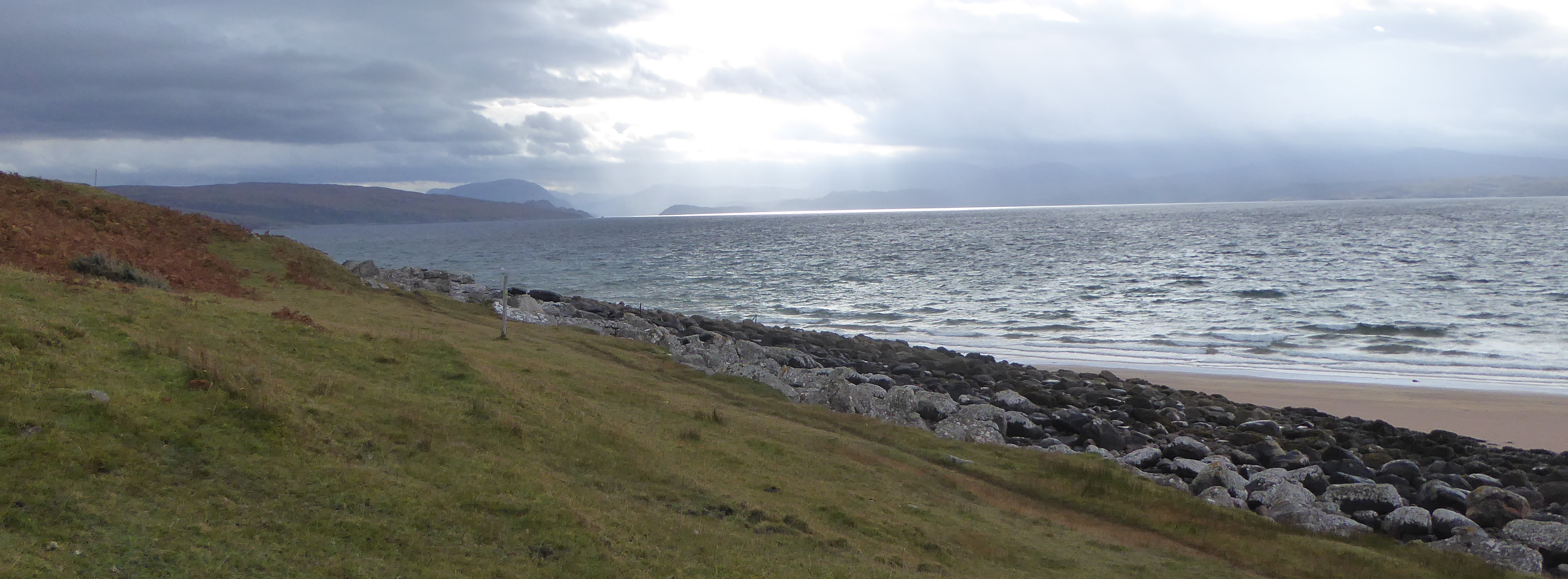 The beach is set against the backdrop of the mountains of the Isle of Skye .Joined to the beach is Eilean Tioram a small grass covered island which can be reached at low tide. I make my way along the road past South Erradale and Opinan.