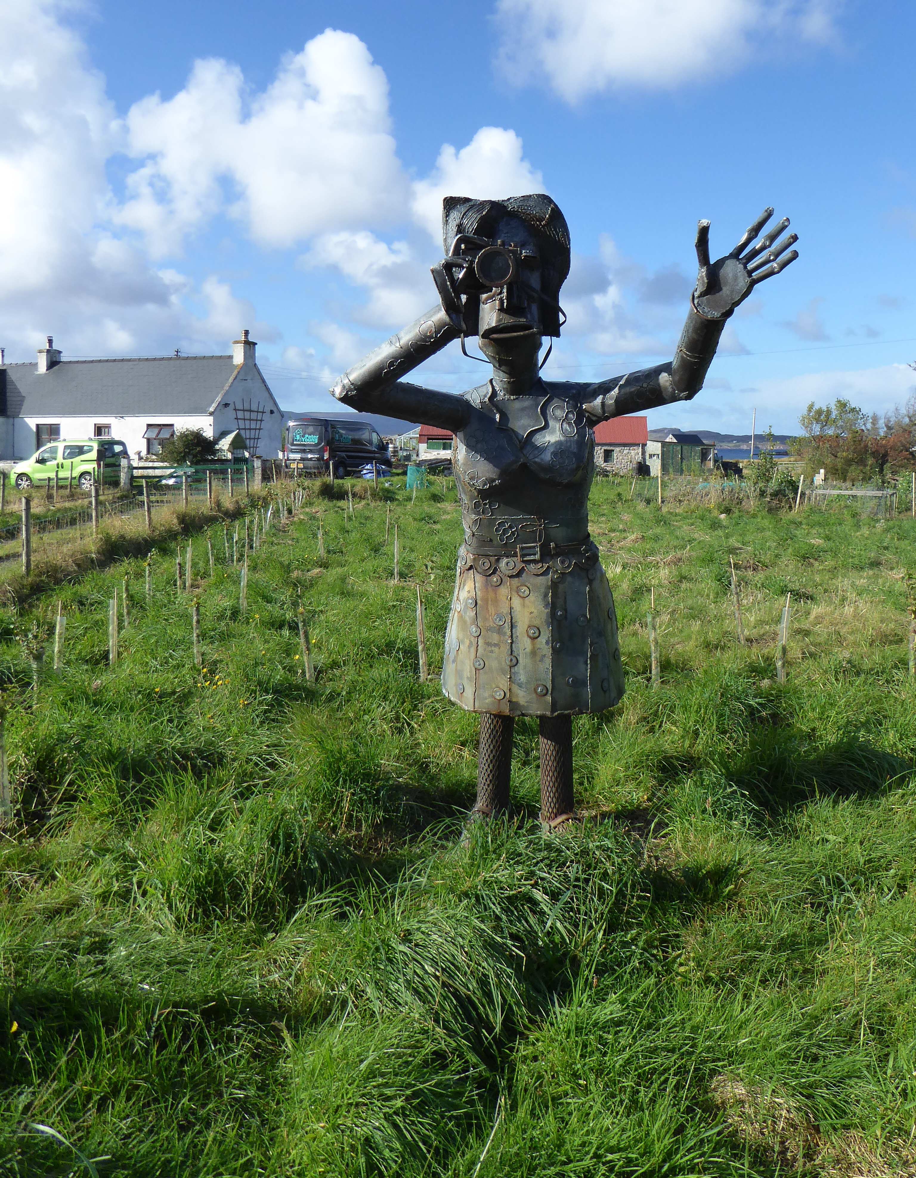 There’s a small naval walk along the coast from Aird Point to some wartime concrete structures with display boards telling the history of the area. I continued on towards Ormiscraig where I passed a Farmstead with a metal scarecrow at the entrance. I’m not sure what his wife thought of it.